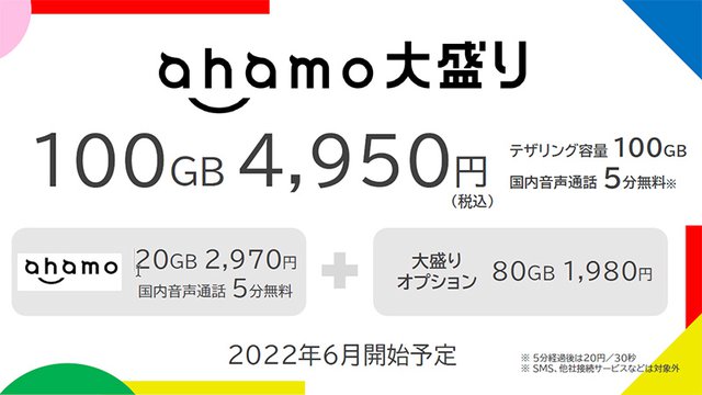 NTTドコモは、「ahamo」の新オプションとして、データ容量100GBを4,950円(以下、価格はすべて税込表記)で使用できる「ahamo大盛り」を6月から開始する。
