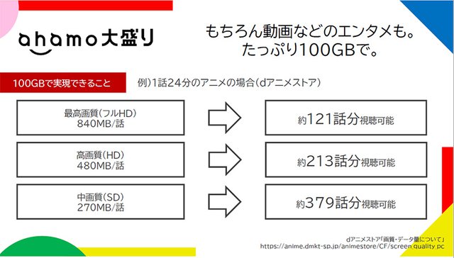 たとえば、dアニメストアで配信している1話24分のアニメでは、最高画質(フルHD)の場合1話あたり約840MBを消費するが、100GBあれば約121話分が視聴可能だと説明。リモートワークでも、映像アリのウェブ会議は約240時間分に相当し、月20日勤務で考えた場合、1日あたり8時間のウェブ会議でも余裕で対応できるとしている。