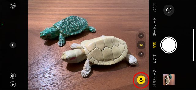 iPhoneのカメラを構えて被写体に近づけると自動でマクロ撮影モードに切り替わり、画面上に黄色い「チューリップのアイコン」が表示される。あえてマクロ撮影を使わずに撮りたい場合はチューリップのアイコンをタップすると機能がオフになる。