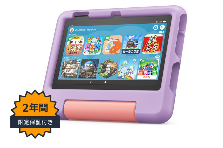 キッズモデルでは上述の仕様を備えつつ、「Amazon Kids+」の1年間のサブスクリプションが付属。Amazon Kids+では、セサミストリートや学研プラスなどの学習系コンテンツや電子書籍など、数千点のコンテンツが使い放題で利用できる。専用のキッズカバーはブルーとパープルの2色で、スタンドとしても利用可能なハンドルを装備。カバー装着時の外形寸法は201×162×28mm、質量は429gとなる。キッズカバーは2,980円(税込)で単売も行う。