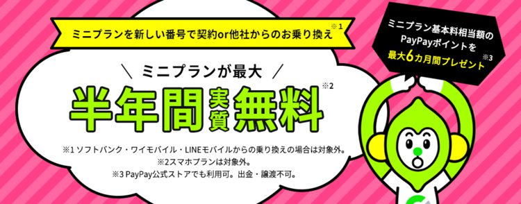 キャンペーン期間中に「ミニプラン」に新規/乗り換え(MNP)で契約することで、6ヶ月間実質無料で使えるというキャンペーン。ミニプランは月額990円(税込)だが、PayPayポイント990円相当が最大6ヶ月間プレゼントされる格好となる。