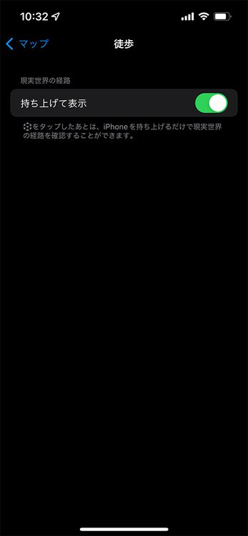 アプリ画面の雪印アイコンをタップするとARウォーキング、「×」をタップすると地図によるナビに切り替わる。「設定」から「マップ」を選び、「徒歩」経路の詳細にある「持ち上げて表示」をオンにすると、ARウォーキングを起動したあとはiPhoneを持ち上げたり、降ろす動作で表示を切り換えられる。