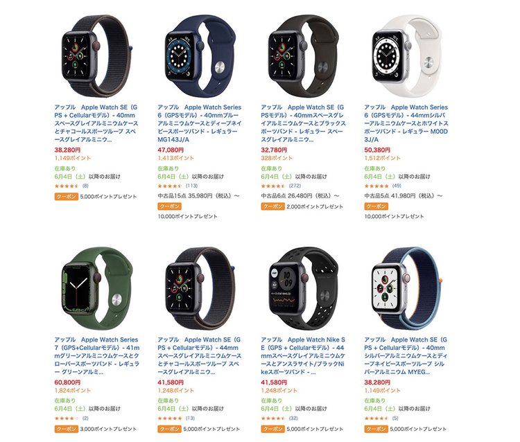 アップルのApple Watchでは、Series 6のGPSモデルが10,000ポイントの対象。またApple Watch SE(GPS+Cellular)モデルについては5,000ポイントがプレゼントされる。