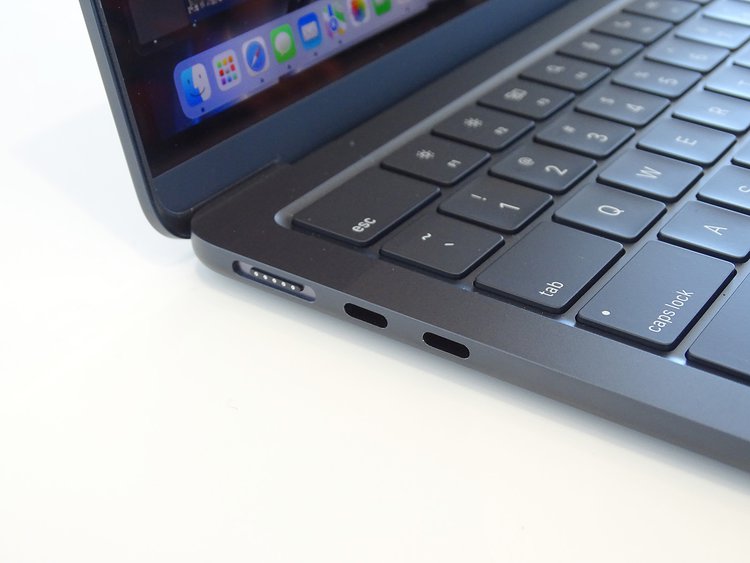 本体の充電はMagSafeケーブルで行うため、2端子あるUSB-Cポートのうちひとつを電源ケーブルの接続に使ってしまうという運用が多かったこれまでのM1 MacBook Airに比べ、新機種は2つのUSB-Cポートを、アクセサリーなどの接続のため、フルに使えることになる。