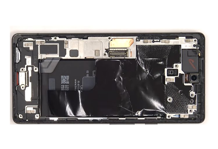 さて画面パネルを外すと、放熱対策として大きなグラファイトシートがあり、それを剥がすだけでバッテリーに手が届く。いくつか取り外す箇所はあるものの、引き出すためのプルタブも付いており、PBKreviewsも「Pixel 6やPixel 6 Proと比べると、このバッテリーをこじ開けるのは、ずっと簡単だった」と述べている。