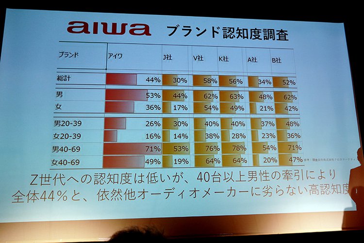 藤岡氏は、aiwaブランドの認知度について、Z世代への認知度こそ低いものの、全世代合計では44%が認知しているという調査結果を紹介。他社オーディオメーカーに劣らない高い認知度を依然として持っているとし、「aiwaは日本の宝物」だと表現。高い技術と安心の品質、優れたコストパフォーマンスが特長のaiwaをデジタル分野で引き継ぎ、「aiwaを再び世界のブランドにする」と意気込みを語った。
