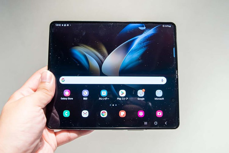 Galaxy Z Fold4は横向きに折りたたみができるスマートフォン。外観は前モデル「Galaxy Z Fold3 5G」から大きな変化はほぼ見られないが、展開時の横サイズが2mm増すも、液晶サイズをそのままに縦サイズおよび厚みを削減。本体質量も前モデルの271gから軽量化した263gとなっている。