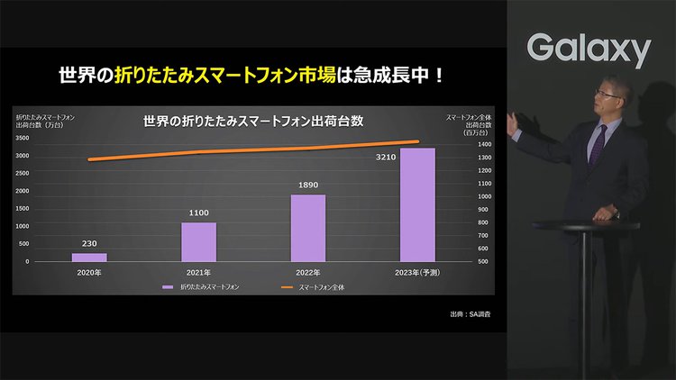 その技術革新のシンボルとして折りたたみスタイルの“フォルダブルスマートフォン”としGalaxy Z Fold4 Flip4を展開していくとアピール。また、同社初のフォルダブルスマートフォン「Galaxy Z Fold」を発売した2020年から現在に至るまでのスマートフォン全体の出荷台数はゆるやかな伸び率になっているが、折りたたみスマートフォン出荷台数は急成長の分野だと説明し、さらに、折りたたみスマートフォンの74%がGalaxyユーザーであるとの調査結果を示した。