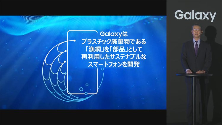 発表会のクライマックスに再度登壇した小林氏は、同社が取り組む持続可能性ビジョン「Galaxy for the Planet」について触れた。今回発表のGalaxy Z Fold4 Flip4や、「Galaxy Buds2 Pro」に廃棄された漁網を再利用した、プラスチック素材を使用したソリューションを紹介した。
