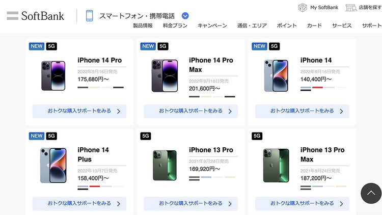 ソフトバンク、iPhone 14シリーズは140,400円から。「新トクするサポート」適用で半額