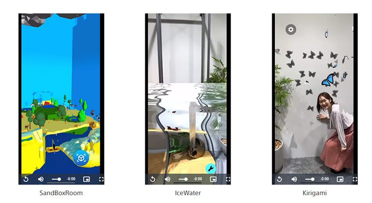 また、メッシュ処理機能を用いて画面上に3Dの仮想空間(メタバース)を作り出す「SandBoxRoom」、まるで水の中にいるようなバーチャル体験ができるという「IceWater」、現実風景における壁や床などを手や足で触れる動作により、バーチャルな蝶を飛ばすことができる「Kirigami」などの機能も利用できる。