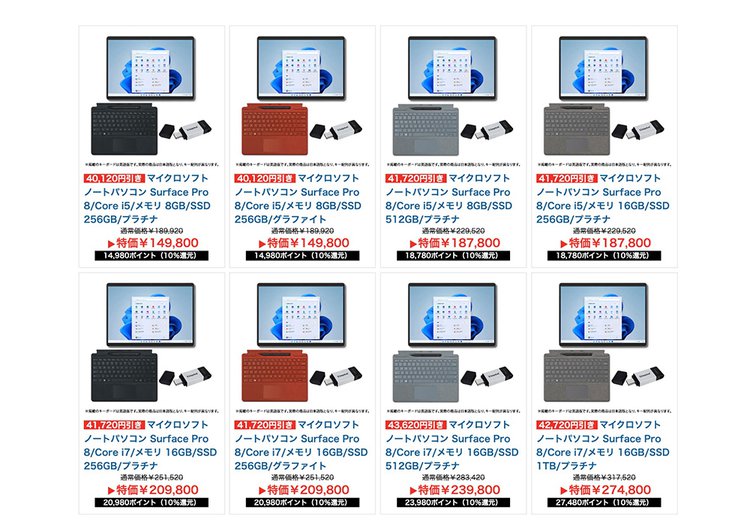 Surface Pro 8とキーボード、ペンなどのセットが値下げされており、最大43,620円OFFとなっている。その値下げされた価格からさらに10%ポイント還元が行われるため、非常にお得だ。