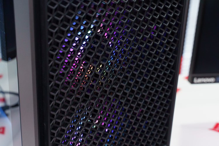 筐体の特徴として、デスクの足元に設置する場合でもアクセスしやすいよう、フロントパネルの電源ボタンやUSBポートを上部に集中配置。また前面のメッシュは単なる通気口ではなく、複雑な立体で構成することで内部のLEDの光を美しく反射するというデザイン上の工夫が凝らされている。
