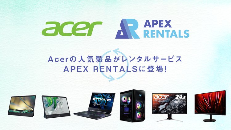 日本エイサーは、ビデオエイペックスが運営するレンタルサービス「APEX RENTALS」にて、Acer製品6機種のレンタルサービスを本日3月24日から開始する。