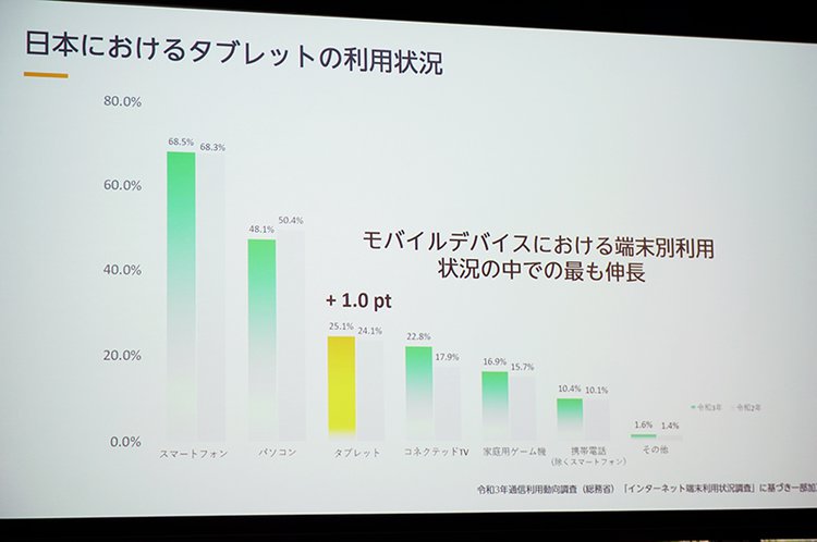開発背景として、日本におけるタブレットの利用状況について解説。現在タブレットの利用状況は、スマートフォンやPCよりも伸長しており、個人でのタブレット端末の利用状況は全体の約25%をシェアしているという。