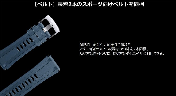 加えてアウトドア用として、耐熱性や耐油性、耐圧性に優れるHNBR素材を採用したスポーツ向けベルトも用意。普段使い向けの短めサイズと、ダイビングのウエットスーツや、スキー・スノーボードのウェア越しでも着けられる長めサイズの2セットを同梱し、使用シーンに合わせて使い分けられる。