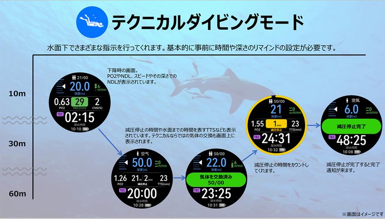 ダイビングモードは、シリンダー無しで潜る素潜り向け「フリーダイビング」、水深40m以内のスキューバダイビング向け「レクリエーショナルダイビング」、水深40m以上のダイビングも考慮し、酸素中毒や減圧症を防止する必要がある「テクニカルダイビング」、深度や時間など基本データのみを盤面に表示させる「スキューバダイビング」を搭載する。