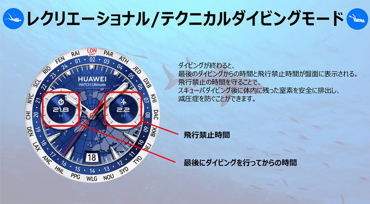 また、レクリエーショナル/テクニカルモードの文字盤には、最後にダイビングを行ってからの経過時間や、飛行禁止時間を表示する。この飛行禁止の時間を守ることで、スキューバダイビング後に体内に残った窒素を安全に排出し、減圧症を防ぐことができる。