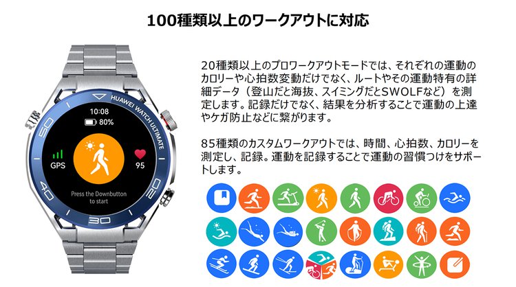 従来のハイエンドモデルに搭載する各種機能も搭載。100種類以上のワークアウトに対応し、様々なシーンでの記録・計測が行える。その内20種類のプロワークアウトでは、登山やスイミングなどそれぞれの運動に特化した詳細データを測定。85種類のカスタムワークアウトでは、時間/心拍数/カロリーを測定・記録することで、運動の習慣つけをサポートする。