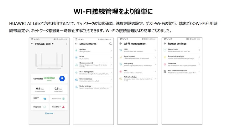 また、専用アプリ「HUAWEI AI Life」と連携することで、ネットワークの状態確認や、速度制限の設定、ゲストWi-Fiの発行、端末ごとのWi-Fi利用時間帯設定、ネットワーク接続の一時停止といった各種操作が可能。トラブルシューティング機能もサポートする。