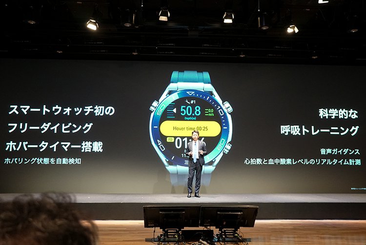 発表会にはフリーダイバーとして活躍する原 哲雄氏がゲスト登壇。すでに何度かWATCH Ultimateをダイビングで使用したという原氏は、「ダイビングでは途中の深度や、その都度自分がいる正確な深度を把握し、理解することが非常に重要」だと説明。WATCH Ultimateによる各種通知は「バイブレーションの振動はウェットスーツ越しでも十分に伝わる、アラーム音も深いの水中でもしっかり聞こえた」とのことで、ダイビングサポート機能の精度の高さを実感したという。