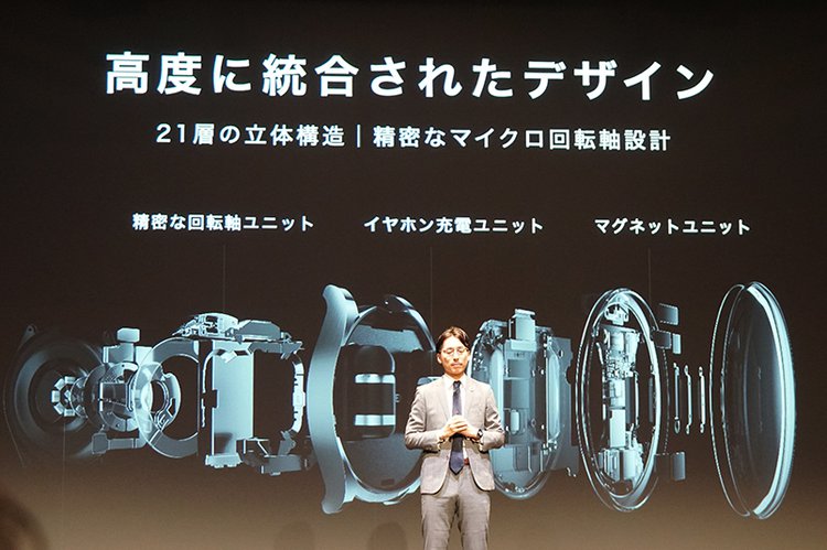 スマートウォッチとイヤホンの機能を維持しながらも、21層にわたる高度な立体構造を採用し、細部を小さくすることに成功したとのこと。また、文字盤にはWATCH Buds専用のものを用意し、イヤホンのバッテリー残量も一目で確認できるデザインになっている。
