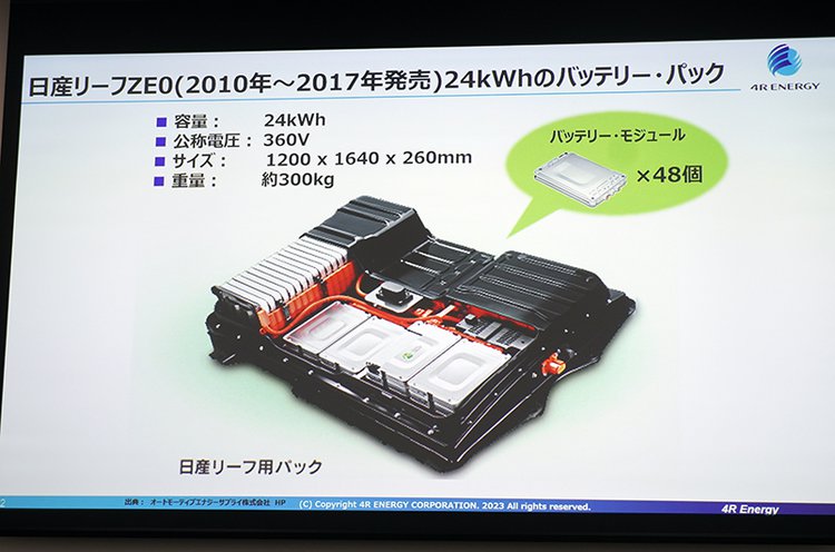 続いて、フォーアールエナジー 社長の堀江 裕氏が登壇。本製品で採用された日産リーフ再生バッテリーの詳細や、その供給面についてのプレゼンテーションが行われた。