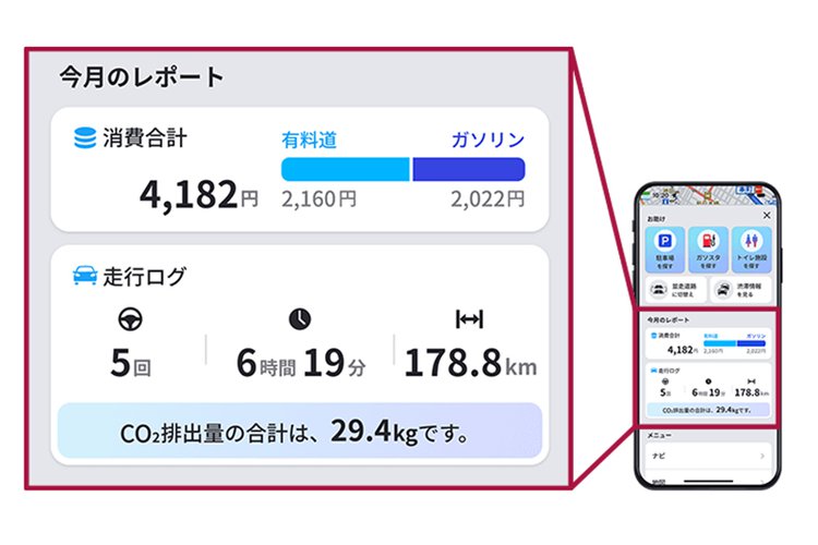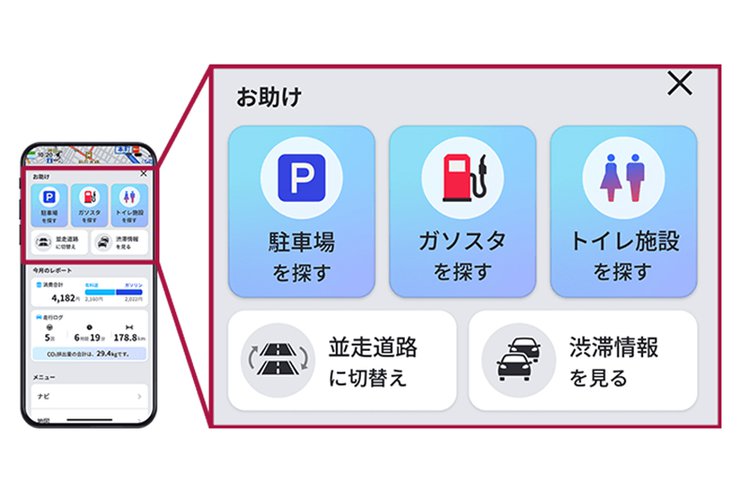アプリ内に「お助けボタン」を設置し、ボタンを押すと、駐車場やトイレ施設の検索、渋滞情報の確認や並走道路への切り替えなどのアシスト機能が利用できる。このほか、走行履歴から取得したログデータをもとに、CO2排出量や毎月のガソリン代金や高速道路料金も表示する。