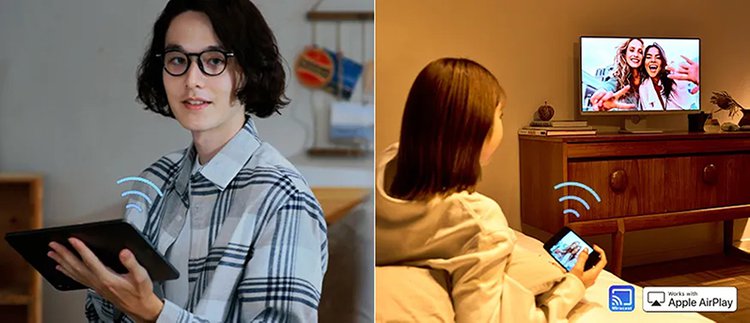 5W+5Wのステレオスピーカーを搭載し、立体感と臨場感あふれるサウンドが楽しめるという。AirPlay 2やMiracast対応によりスマートフォンやタブレットとのリンクが可能で、日常で撮影した写真や動画を大画面で楽しむことができる。
