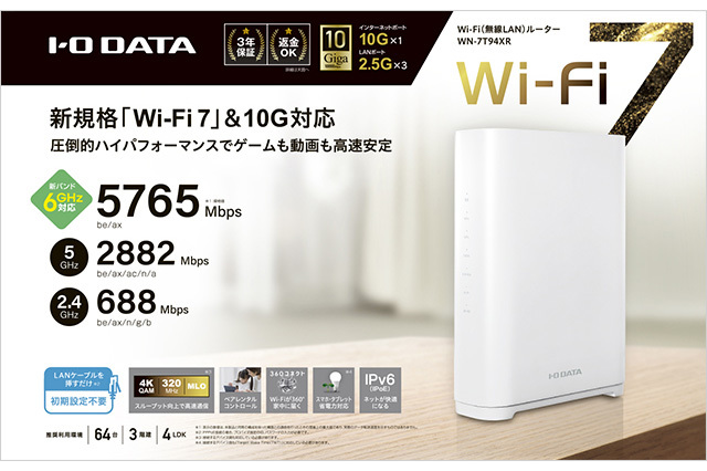 アイ・オー・データ機器、初のWi-Fi7対応トライバンドルーター「WN-7T94XR」