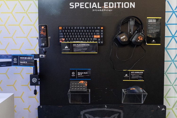 そのほか、ヘッドホンは有線モデル「VIRTUOSO PRO」や無線モデル「HS80 MAX WIRELESS」を用意。Elgato(エルガト)ブランドのショートカットキーボード/マイク/カメラ/キャプチャーユニット/LED照明などを体験できる配信スペースのイメージ展示も行われている。