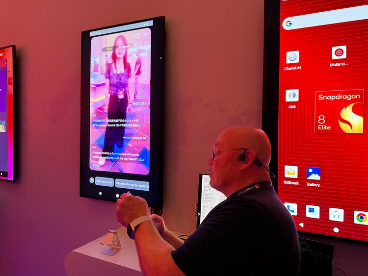 イベント会場ではSnapdragon 8 Eliteを載せたモバイルデバイスのプロトタイプによる、様々な種類のデモンストレーションを体験した。中国のAIソフトウェアベンダーであるZhipu AIによる画像解析ソフトは、スマホのカメラで捉えた人物の画像をリアルタイムに解析。性別や出で立ち、着ている服などを文字と音声による情報に変換して伝えることができる。同じ端末でレシートをスキャンすると、自動的に金額を認識して“割り勘”等の計算を素速く行う。プロトタイプの端末上で様々な生成AIがスムーズに連携する様子を確認できた。