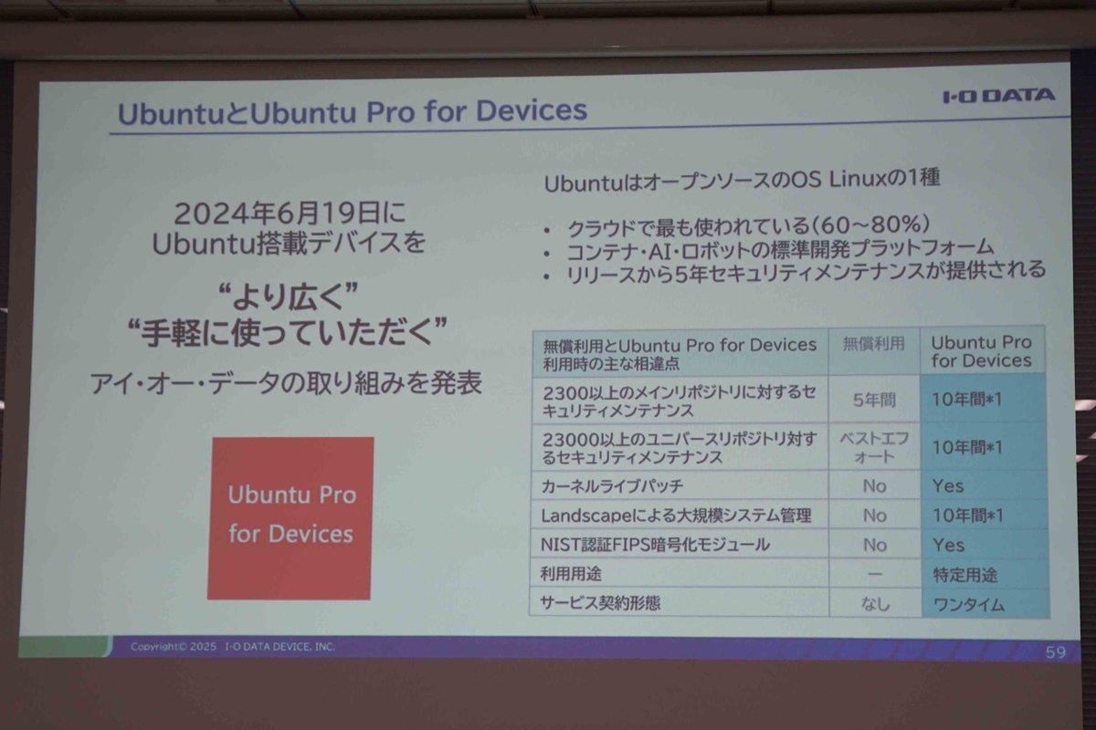次に2024年6月に発表した「Ubuntu Pro for Devices」について解説。「Ubuntu」(無償版)と比較して、カーネルライブパッチ/NIST認証FIPS暗号化モジュールが利用でき、Landscapeによる大規模システム管理も10年間利用できる。