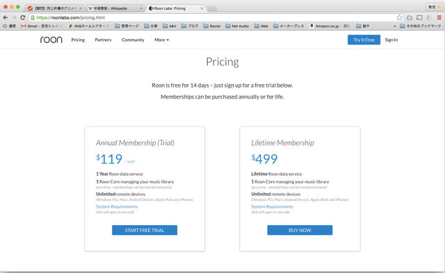 Roonの価格はライセンス制で、1年単位の年間使用ライセンスと、一回課金だけの終生ライセンスがあります。価格は年間使用ライセンスが$119/年です。一回課金だけの終生ライセンスは$499となります。