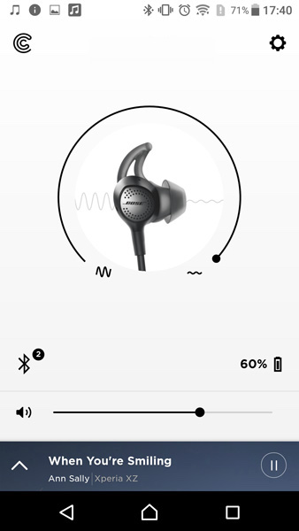 消音レベルは本体のリモコン、またはスマホアプリ「Bose Connect」から調節できる。ステップが12段階に細分化されているので、現在の段階をパッと目で見ながら把握しやすいのはアプリの方だと思う。消音レベルを一気に最小から最大へシフトしたい時にも、スマホアプリのスライダーを使った方が操作は素速く行える。