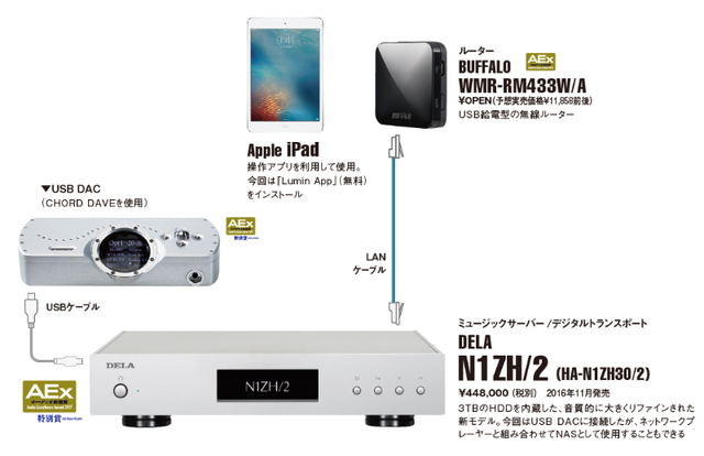 今回は、<3>を試していただいた。ミュージックサーバーはDELAの「N1ZH/2」を、USB-DACにはCHORDの「DAVE」を使用する。そのほか小型で設定が要らないバッファロー社のネットワークオーディオ用ルーター「WMR-RM433W/A」を使ってWi‐Fi環境を作り、iPadをそこに接続する。