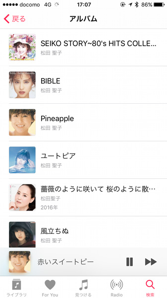 Apple Musicで配信されている楽曲のカタログを検索すると、洋楽系のミート率が高く、邦楽系が低めの「洋高邦低」な印象。比率はスタート時から大きく変わらないが、全体に楽曲が増えているので、伴って邦楽の品揃えもだいぶ良くなった。開始時に松田聖子を検索して見つからなかったときには愕然としたが、今はしっかりフォローされている。新曲・新譜は他の音楽配信で公開前に、Apple Musicで先行して聴けるものも見つかった。