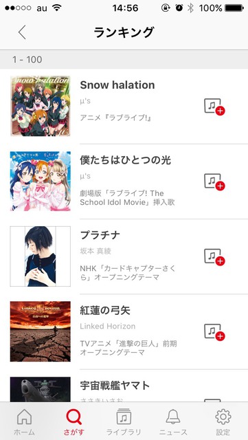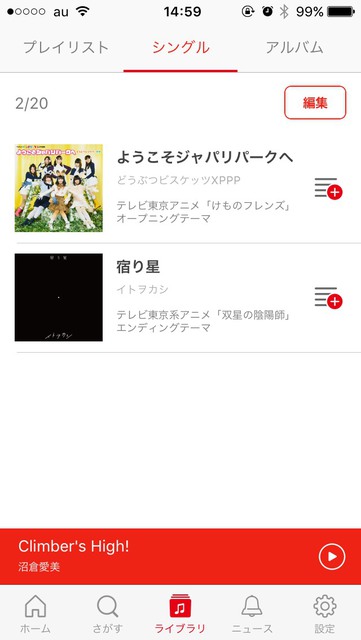 また楽曲再生画面では、タイトル、アーティスト名に加え、“どのアニメのOP/EDか”といった情報が表示されるのは嬉しい。再生画面には「ライブラリへの追加」「歌詞表示」「楽曲情報表示」のアイコンが用意されている。