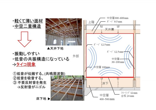 基本的にはマンションの場合と同様に、戸建て住宅でもほとんどの下地構造が背後に空気層を持つ中空二重構造になっている、それ故下地材が共振しやすくそれが反射音をニゴらせる元凶になっている、という解説をしました。