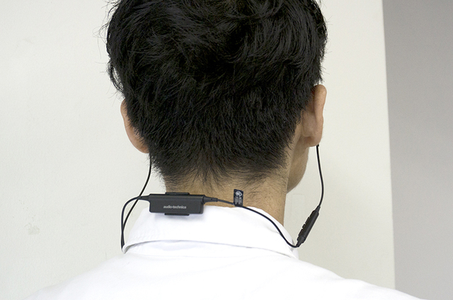 カラーバリエーションはグラファイトブラック、シャンパンゴールド、ガンメタリック、ブリリアントレッドの4色構成で、表面処理は高級感あるアルマイト処理が施される。対応コーデックはSBC、AACのほか、高音質なaptXにも対応。内蔵バッテリーの充電時間は3時間で、最大使用可能時間は7時間となる。装着性を考慮し、バッテリーとイヤホンは別に分けた作りとなっており、バッテリー部はちょうど襟元にくるような形で重量バランスも良好だ(襟元で固定するクリップも同梱)。