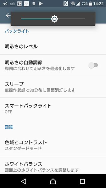 ところが本機はそうした不満の声を聞き入れたのか、「画質」という調整項目を持ち、さらにその中には「色域とコントラスト」「ホワイトバランス」「動画再生時の高画質処理」(X-Reality for mobileのON/OFF)の3つの項目を個別に調整できるようになった。