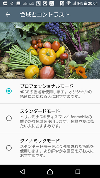 前回のXperiaXZは、記事中でも指摘したが、画質モードとして「X-Reality for mobile」「ダイナミックモード」「OFF」と3つのプリセットを備え、ワンタッチで切替ができる代わりに、色表現が最も素直な「X-Reality for mobile」を選ぶと「X-Reality for mobile」(超解像処理)がオフにできずシュートが見え、「OFF」で「X-Reality for mobile」をオフにすると今度は色が派手になってしまうという痛し痒しの状態だった。