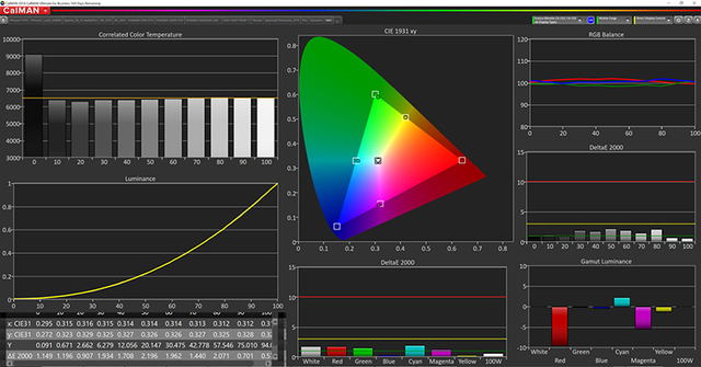 測定結果を見ると、白100%のポイントでホワイトバランスをD65に整えると、おおむね暗部まできちんとD65に揃った。ガンマも2.2の黄色い基準ラインにピッタリ沿い、階調表現も基準に忠実であることが読み取れる。DeltaE 2000の値を見ると、グレースケールの30%〜80%で少し乱れているように見えるが、許容上限とされるΔ3を楽々と下回る水準。