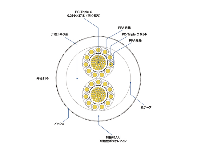 PC-Triple Cを採用したスピーカーケーブル「SP-10」では、径の異なる導体で中心部と外周部を構成する従来のストラタム構造を見直し、外周部の導体にも個々に絶縁を施したスーパーストラタム構造へと進化した。中低域用の中心導体は、同心撚りのPC-Triple CにPFA(フッ素樹脂)絶縁を施し、高周波が流れる外周部には、リッツ線構成のPC-Triple C単線導体を11本、そのすべてにPFA絶縁を施して同心円上に配する構造を採用している。