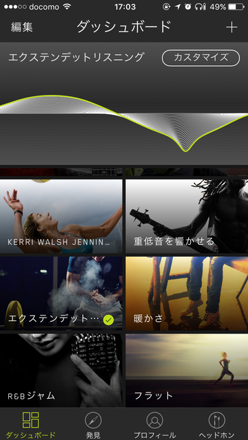 そんな初期設定を踏まえ、改めてJaybird X3 Wirelessの本来のサウンドを聴いてみようと、まずは「フラット」セッティングに挑戦。文字通り帯域バランスを整えた形で素直に音情報を引き出す。より自分好みの音を追求するなら、イコライザーを操作して直接カスタマイズもできるが、特に活用して欲しいのが「発見」のタブからアクセスできるプリセットだ。