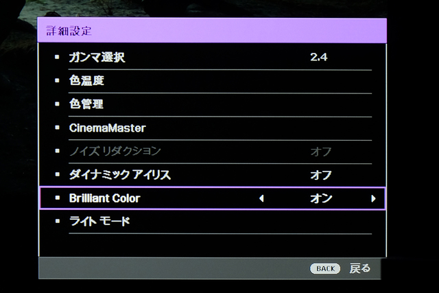 次は、選択した「シネマ」モードをベースに画を追い込む作業。ガンマはデフォルトが「2.2」なので、DCI-P3基準で暗室にも適するよう「2.4」に変更。中間調の明るさが落ち着き、暗室では映像の暗部が引き締まってコントラスト感もアップする。