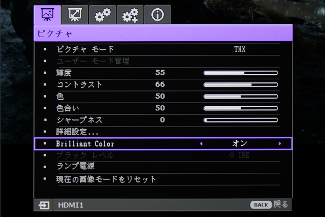 本機の特徴を活かすためにも、「THX」モードをベースに追い込むのが得策だ。今回の視聴環境は完全暗室で相対的に黒が浮き気味に感じるので、まず、ランプは明るい「標準」状態ではなく「省電力」に。絶対的な輝度は低減するが、暗部が引き締まって落ち着く。