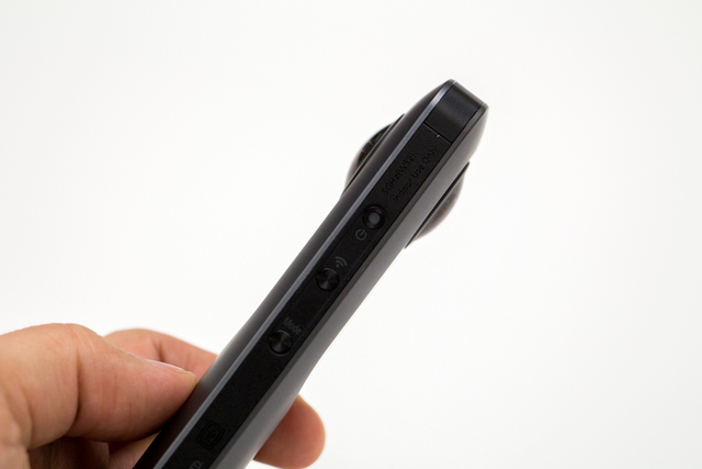 THETA Vは、片手で握って撮影するのにちょうどよい大きさのスティック型デバイスとなっている。カメラの上部には、前後の両面に魚眼レンズがやや飛び出すかたちで搭載。静止画モードで撮影ボタンを押すと、360度の全天球を1枚の静止画として撮影する。