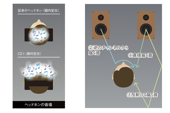 そこで注目したいのが、クロスゾーンの「CZ-1」である。頭内定位の解消に本格的に取り組んだ話題作で、自然な音場を重視するリスナーの間で着実な支持が広がっている。定位を改善する方法は、スピーカー再生時と同様、反対側のチャンネルから耳に届く成分、そして部屋の壁などで反射された間接音成分の両方をハウジング内で直接音と重ね合わせ、立体感を引き出すというもの。