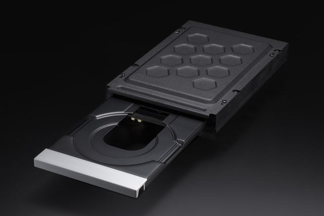 心臓部ドライブメカは制振黒塗装のハニカムカバーで覆われ、往年のハイビジョンLDプレーヤー「HLD-X0」を彷彿させる。そのドライブメカは高剛性鋼板を介してメカベースに固定されるが、減衰性の高いパルプ素材を挟み込んだフローティング構造とする凝り様だ。これでドライブ内外に発生する共振と定在波をカットした。ユーザーが日常インターフェースするディスクトレイは捻れ耐性に優れたアルミダイキャスト製だ。